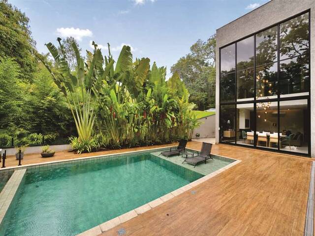 - Piscina 7m x 3,5m com borda infinita, prainha, voltada para área preservada, aquecida por trocador de calor, iluminada, solário e casa de máquinas.
